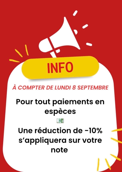 Profitez de réduction en réglant en espèce lors de votre repas !